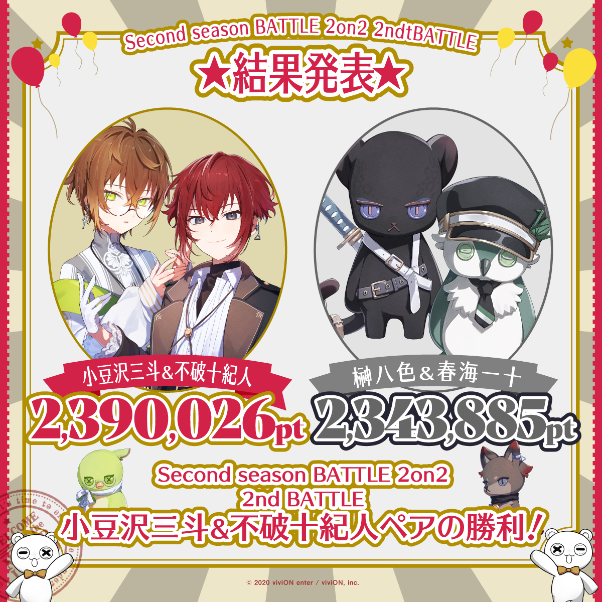 Second season BATTLE 2on2 2nd BATTLEでは、小豆沢三斗と不破十紀人のチームと榊八色と春海一十のチームによる熾烈な戦いの末、小豆沢三斗と不破十紀人が勝利を収めました!