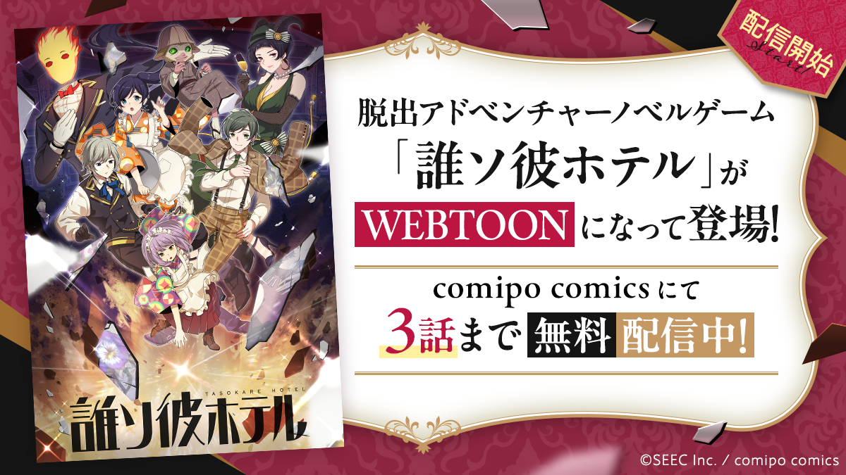 株式会社viviON(所在地:東京都千代田区、代表取締役:明石耕作)は、本日12月26日(木)より、人気ゲーム『誰ソ彼ホテル』(株式会社SEEC、本社:東京都渋谷区、代表取締役:阿部 隆太郎)のストーリ―を基にした、WEBTOON(フルカラー縦読みコミック)をマンガアプリ『comipo』における連載をスタートしました。