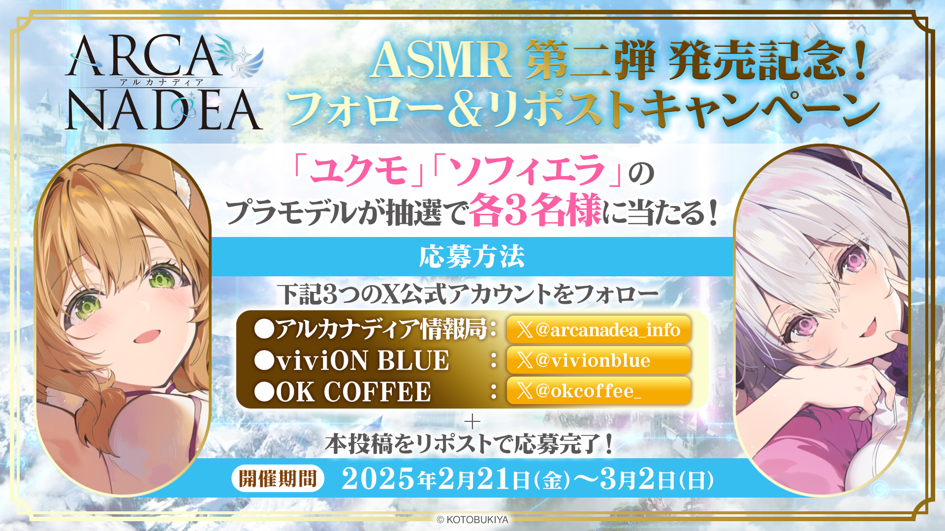 2次元コンテンツとコラボした商品やオリジナルグッズの企画・販売を手掛ける総合バラエティーストア『viviON BLUE』(株式会社viviON、所在地:東京都千代田区、代表:明石耕作)は、ホビーメーカーの株式会社壽屋(本社:東京都立川市、代表取締役社長:清水一行、以下、コトブキヤ)が手がける「SF×ファンタジー」を題材としたプラモデルシリーズ『アルカナディア』とコラボレーションし、特典ASMR付きの限定グッズを販売いたします。