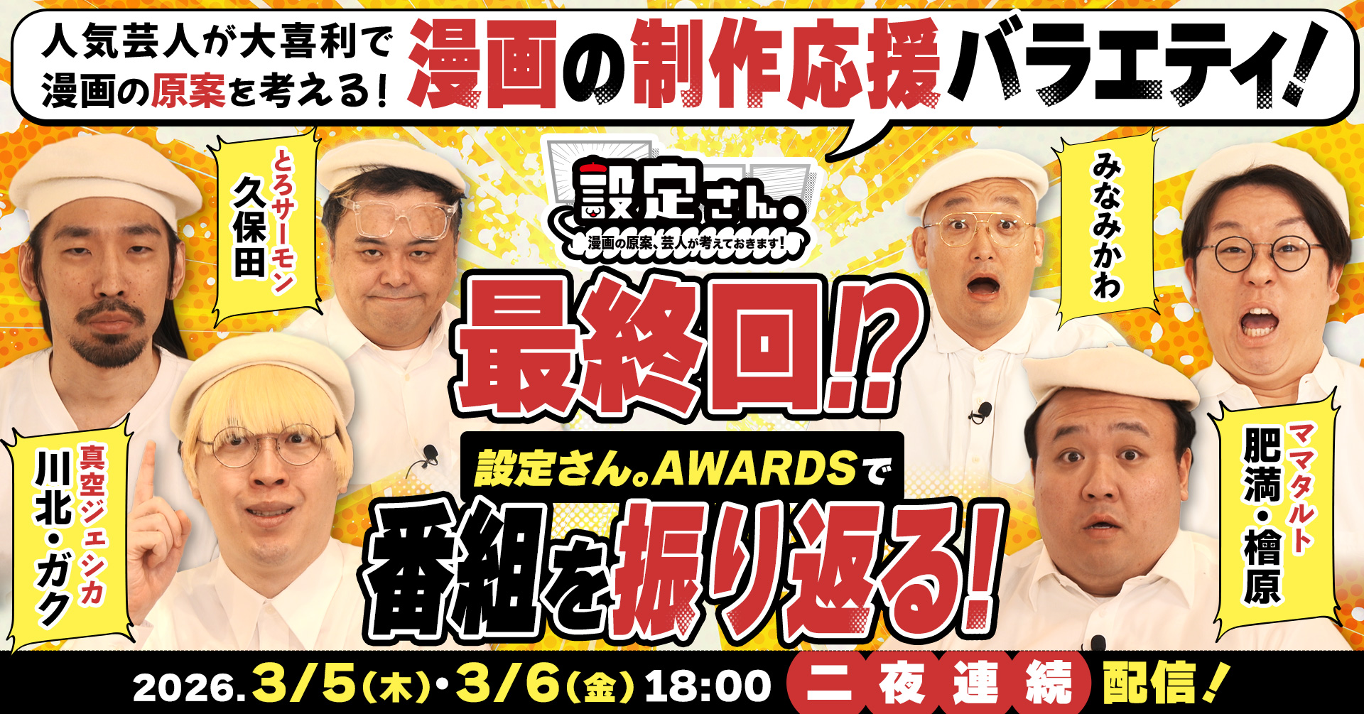 ついに最終回!? 人気芸人たちが大喜利で漫画の設定を考えるバラエティ番組『設定さん。』シーズン13が3月5日(木)より2夜連続配信 〜フィナーレを飾る賞金総額は残り200万円! 過去すべての「設定」で漫画作品を募集~